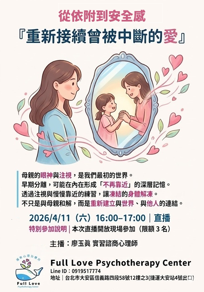 在家族系統排列中有「重新接續曾被中斷的愛」的練習,若從法國精神分析學家拉岡的鏡像階段理論來理解,可以把這個過程看成是回到我們最早學會與人連結、也開始形成自我感的地方。