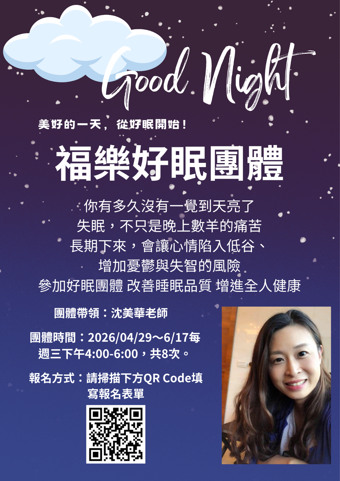 透過團體,幫助成員檢視個人的睡眠習慣,並從睡眠醫學、認知行為等理論來了解自我為何產生失眠等問題(非藥物治療),以及學習倚靠上帝的力量,找到正向能力來面對失眠的困擾,改善睡眠品質,進而達到全人的身心健康。