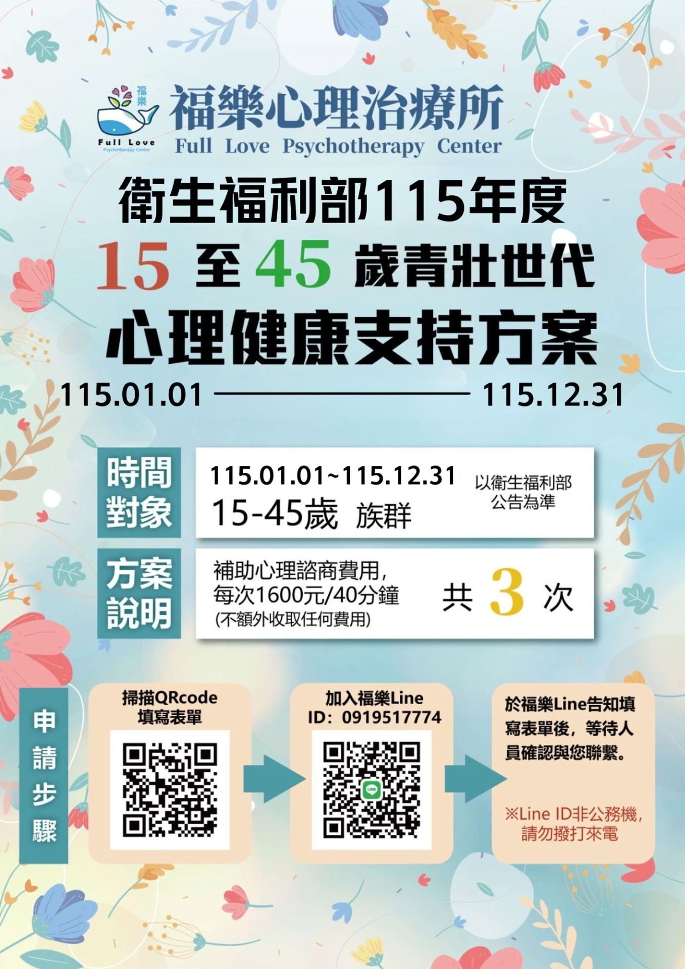 福樂心理治療所配合衛生福利部「15-45歲青壯世代心理健康支持方案」: